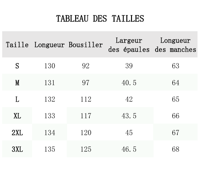 Matière : Mélange de fils haut de gamme (poids total du vêtement : environ 1 kg)