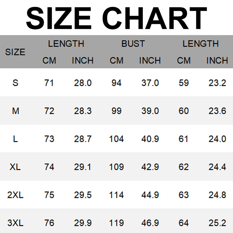 | Taille | Longueur | Tour de poitrine | Longueur des manches | |||