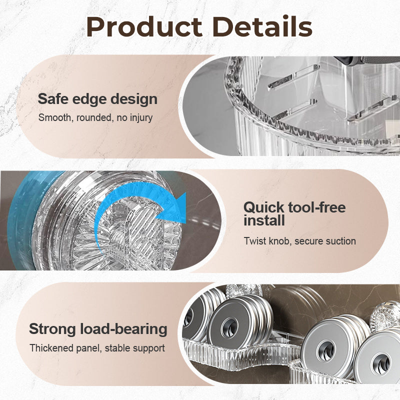 INSTALLATION FACILE SANS OUTIL : Il suffit de tourner et de serrer la molette pour fixer fermement la ventouse. La conception d'adhésion sous vide assure une stabilité forte sans endommager les murs ou les surfaces. De multiples bords finement polis rendent la manipulation sûre, évitant les égratignures ou les blessures aux mains.
