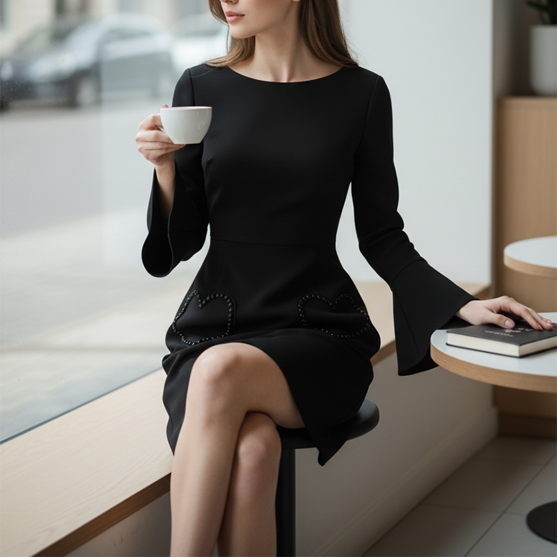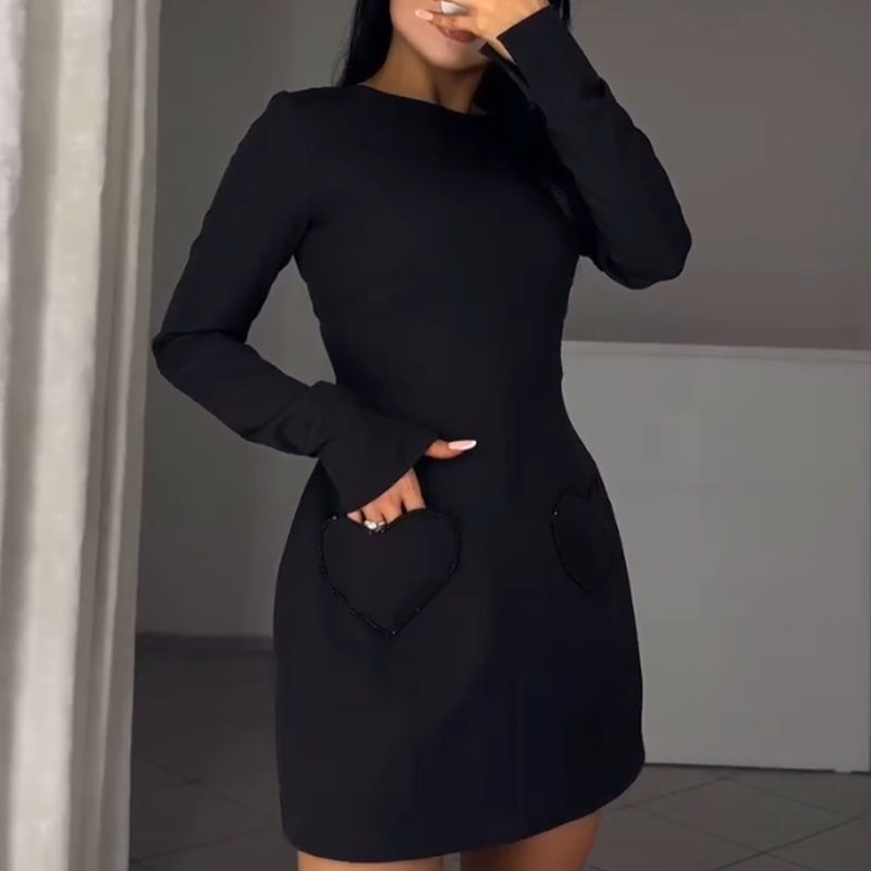 DES POCHES EN FORME DE CŒUR POUR UNE TOUCHE DE CHARME - En forme de cœurs, ces poches ajoutent une touche romantique à la silhouette noire classique, rendant la robe à la fois ludique et poétique. Elles sont également très pratiques, vous permettant de garder vos essentiels à portée de main.