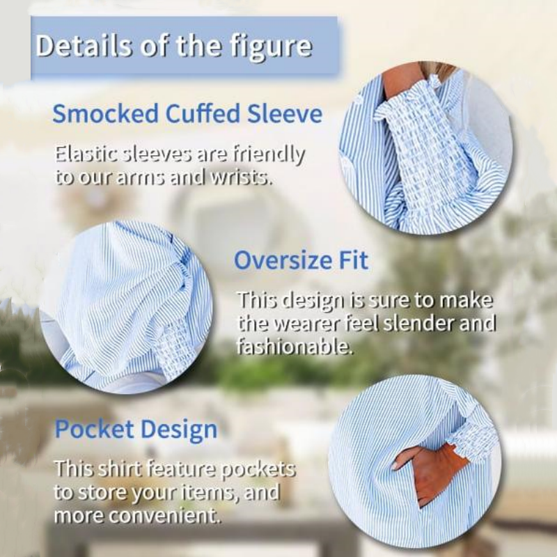 🔥Dernier jour des soldes 49 % DE RÉDUCTION🏆️Chemise mi-longue smockée avec col rayé et manches oversize retroussées